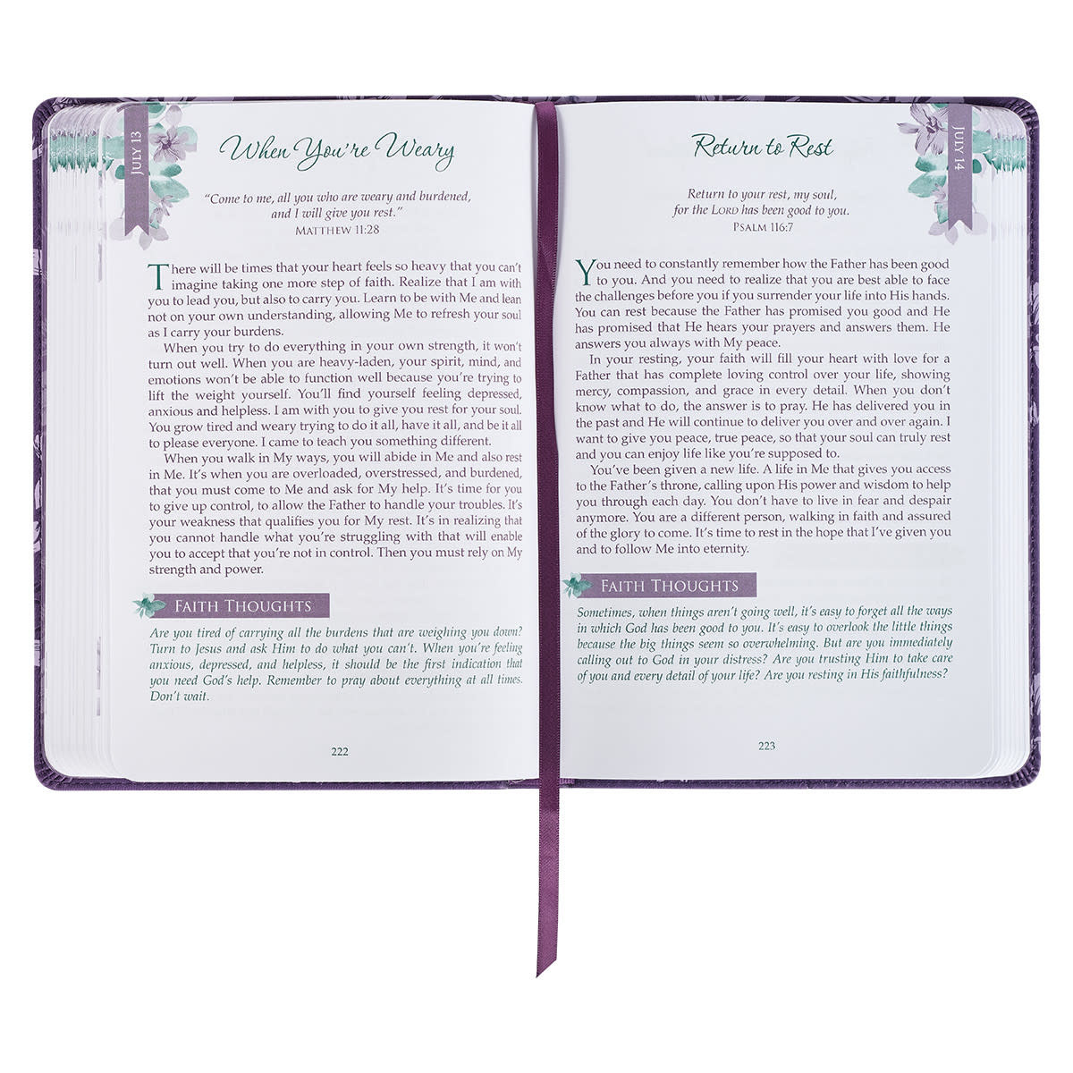 The faux leather devotional opens to lovely purple end pages, followed by a presentation page that lets you personalize the book or inscribe it with a message when you give it as a gift. The two-color printed interior pages feature purple floral bouquets at each top corner and purple banners that highlight areas of the page. A purple satin ribbon marker is included for your convenience.