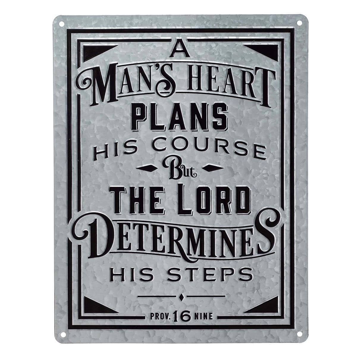 The A Man's Heart Vintage Metal Wall Art is the perfect item to go on the wall in your husband's man cave to remind him that God has his future in the palm of His hand. The wall art sign is made from galvanized metal and embossed with black. The message is taken from Proverbs 16:9, "A man's heart plans his course, but the Lord determines his steps."