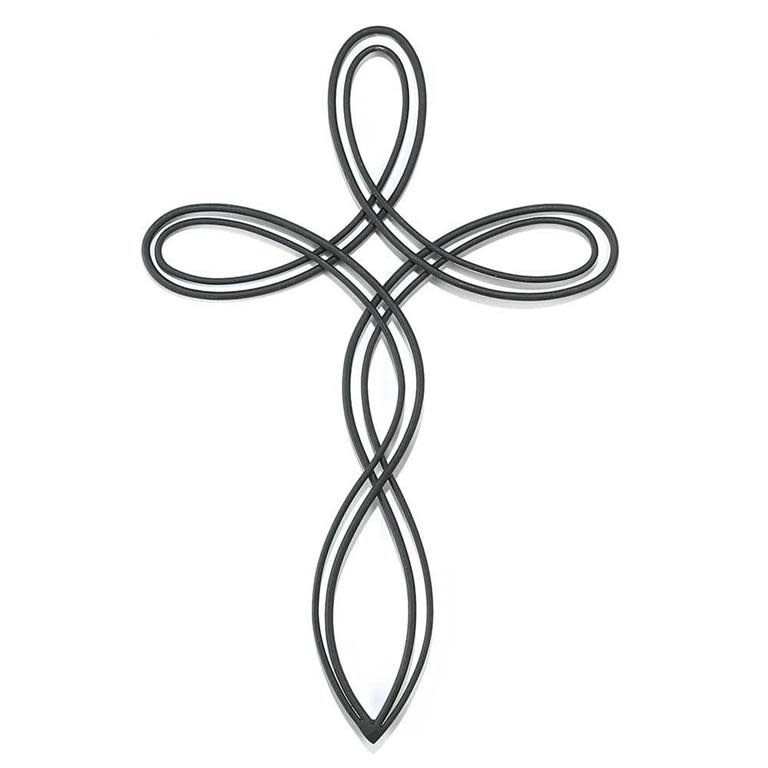 This lovely wall cross has a loop pattern that flows unbroken around the cross. Black metal; height is 16 inches.